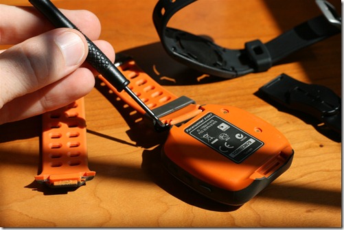 -[D] śrubokręt z teleskopem umożliwiający wypięcie oryginalnych pasków z Forerunnera 310XT i zamocowanie adaptera [C]