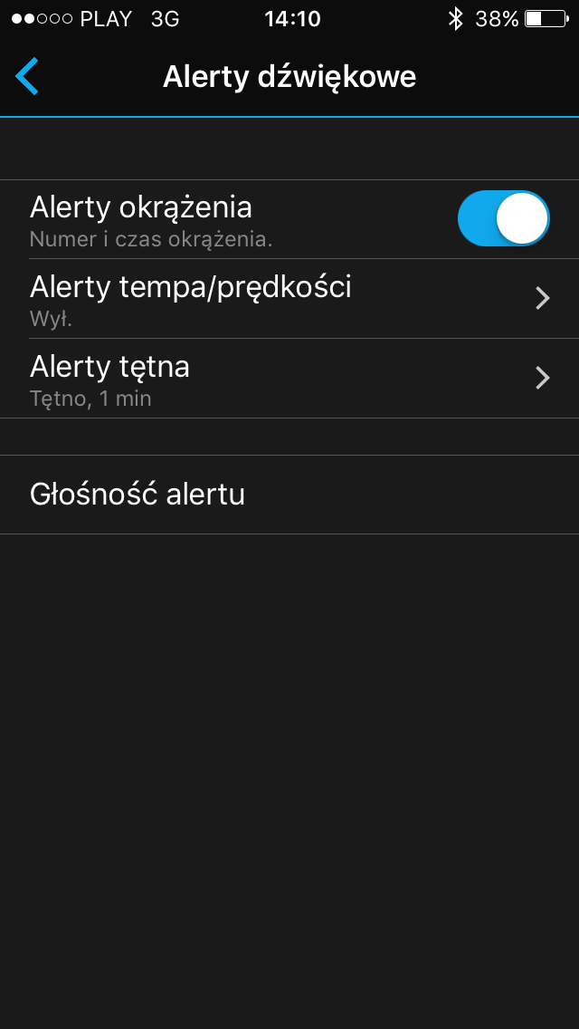 - W tym miejscu można ustawić trzy rodzaje alertów. Alert okrążenia informuje głosowo o czasie ukończenia okrążenia oraz o numerze okrążenia. Druga opcja to Alerty tempa/prędkości: