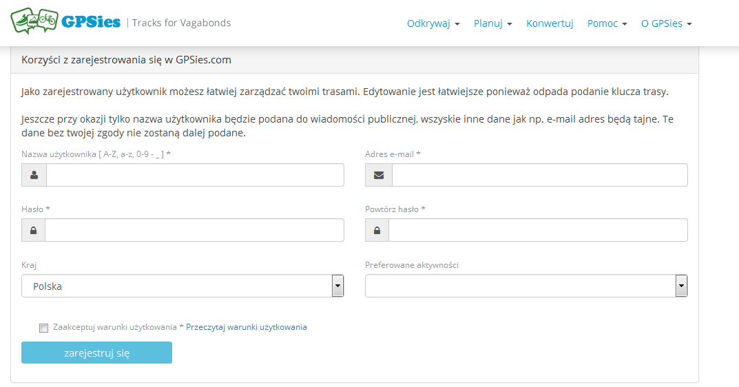 6. Po zaprojektowaniu trasy klikamy w przycisk „Zapisz” powyżej mapy. W następnym kroku, aby pobrać stworzoną trasę musimy utworzyć konto w portalu gpsies.com. W tym celu wpisujemy niezbędne dane i klikamy „Zarejestruj się”.