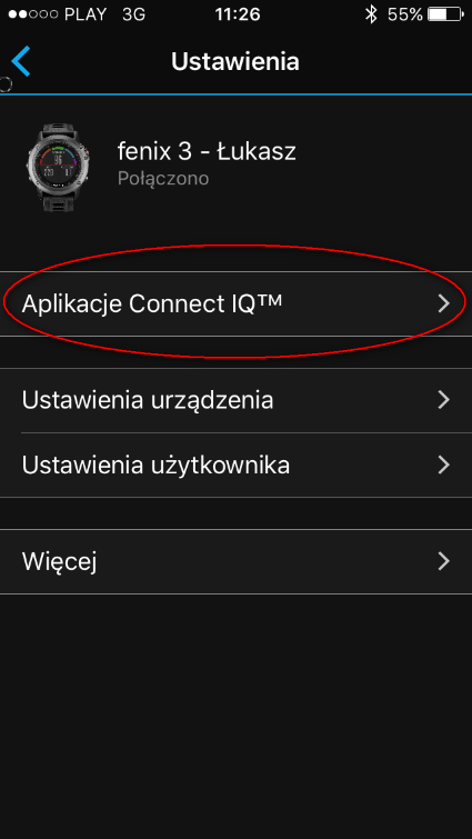 Wybieramy zegarek Garmin Fenix 3. Zegarek musi być połączony z telefonem po bluetooth: