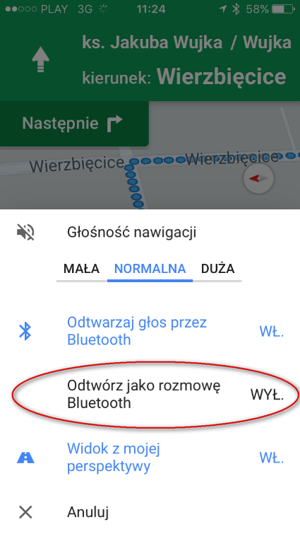 U mnie nie działa ponieważ nie mam w opcjach aplikacji Mapy „Odtwórz jako rozmowę bluetooth”. O co kaman? Ktoś pomoże?