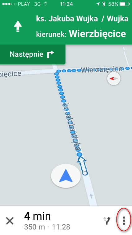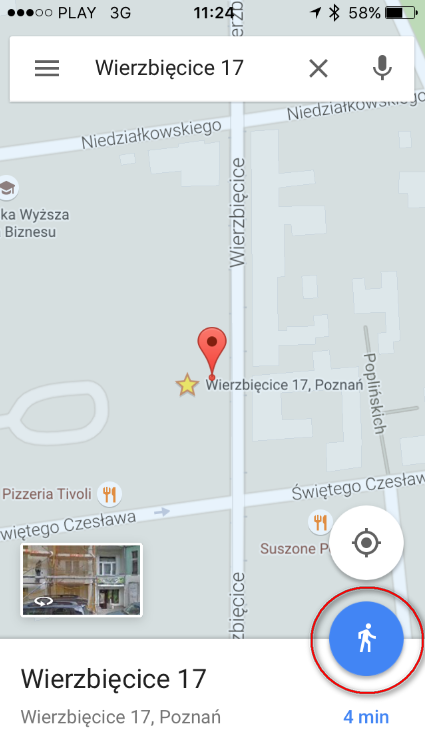 Po zakończeniu instalacji, uruchamiamy aplikację i wybieramy adres lub miejsce do którego chcemy dotrzeć. Rozpoczynamy nawigację. Poniższe zrzuty ekranowe pochodzą z Iphone 5. Wygląd aplikacji Google Maps w systemie Android może się nieco różnić.
