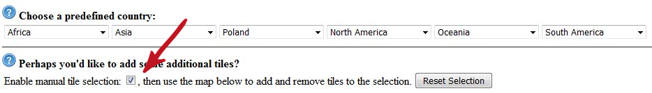 W następnym polu zaznaczamy „Enable manual tile selection” dzięki czemu będziemy mogli wybrać rejon map jaki nas interesuje: