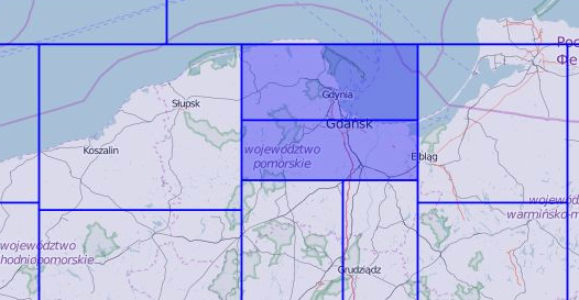 Klikając na pola znajdujące się na mapie, wybieramy obszar który chcemy wgrać do urządzenia. Będzie on podświetlony tak jak na obrazku poniżej. W naszym przykładzie chcemy wgrać okolice Trójmiasta: