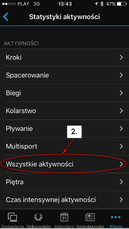 Uruchamiamy aplikację Garmin Connect Mobile w zgodnym smartfonie i wybieramy z listy Statystyki aktywności [1.]