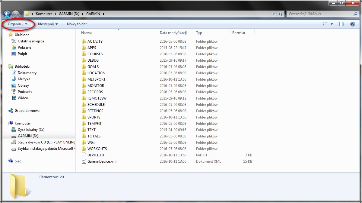 Po tym jak komputer rozpozna nowe urządzenie otwieramy jego folder główny, a następnie folder o nazwie Garmin:
