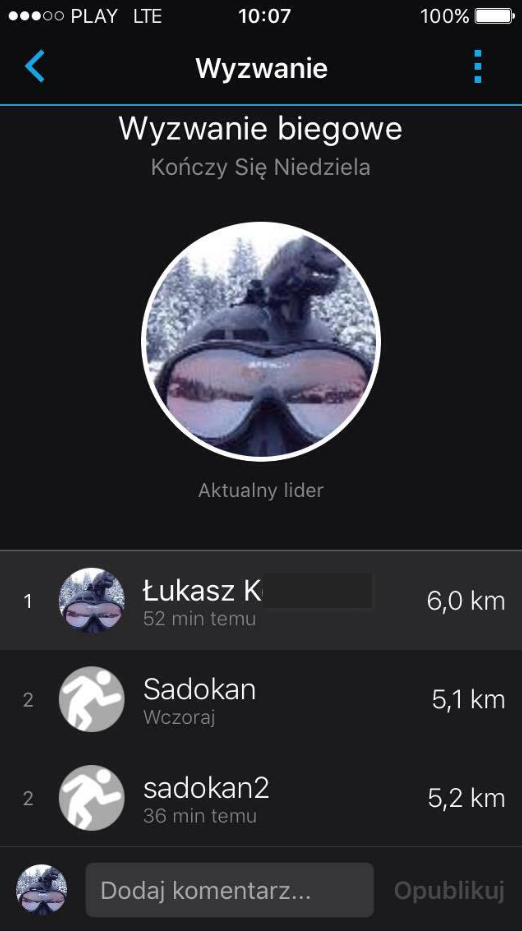 Po zaakceptowaniu zaproszenia otrzymasz potwierdzenie o tym kto dołączył do wyzwania. Potwierdzenie otrzymasz również w formie plakietki i maila. Od teraz na liście widać kto ile kilometrów pokonał w ramach danej aktywności oraz kto jest aktualnym liderem wyzwania: